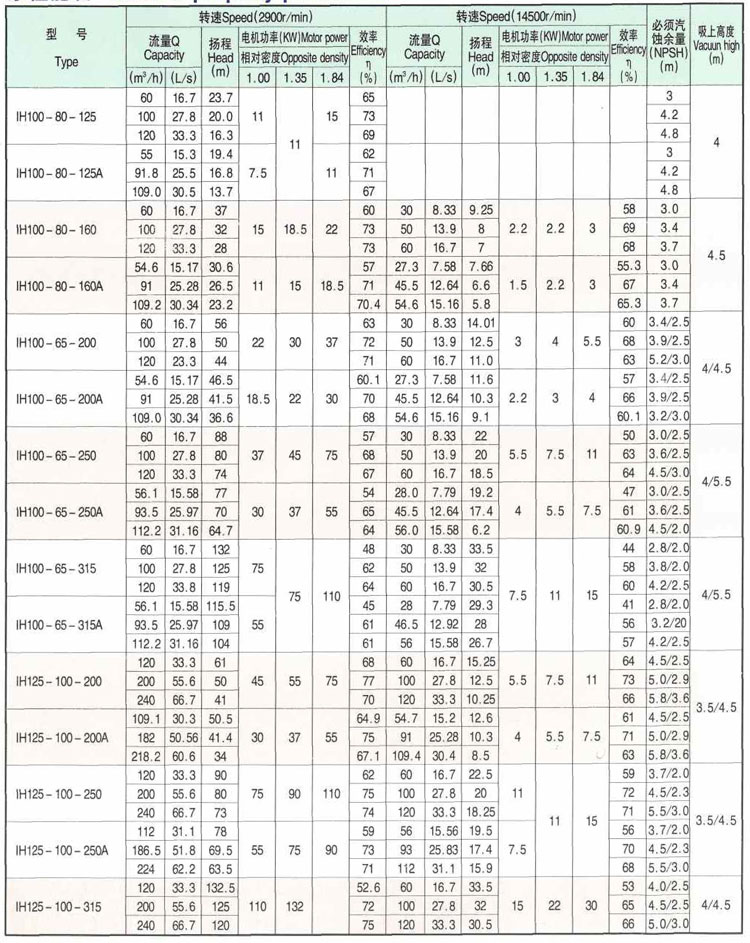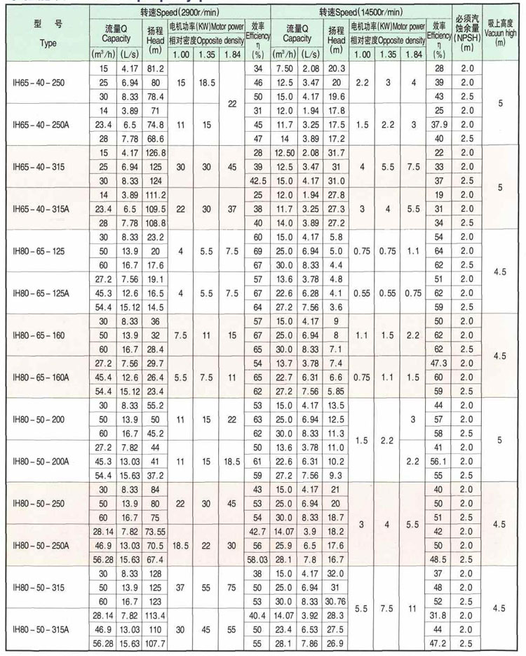 H型泵是全國泵行業采用IS02858國際標準聯合設計的系列產品,具有性能范圍廣、效率高、“三化”水平高和維修方便等特點。舊型系列泵有40個基本型,其中33個雙速(2900、1450r/min}經過A、B兩種型式的葉輪直徑切割變型后,達112個規格。