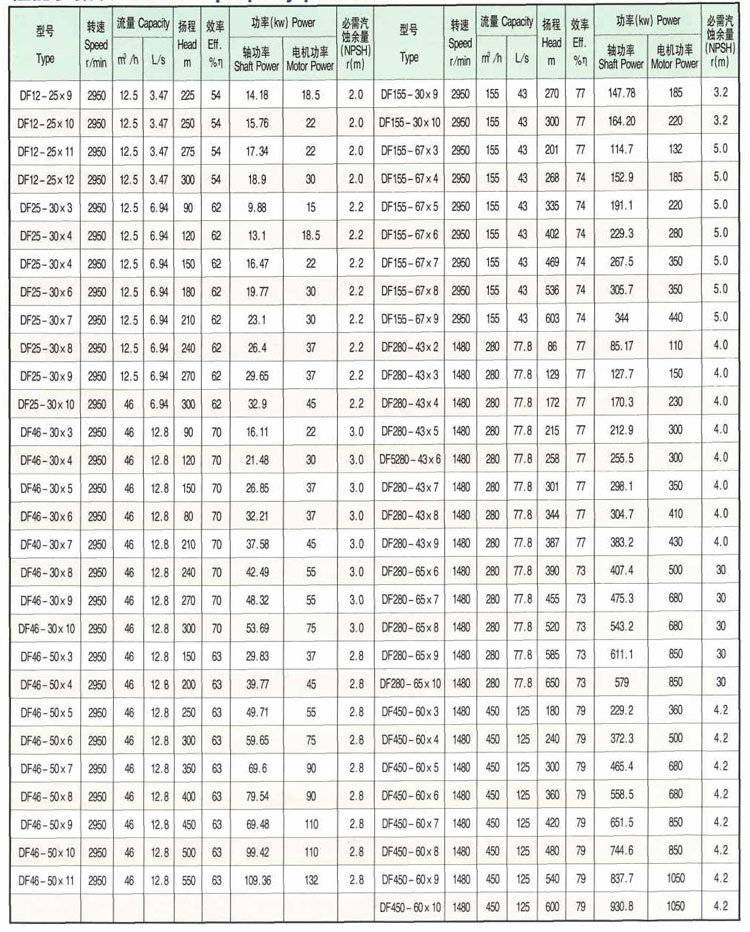 DF型泵為臥式、單級、多級節段式離心泵,用穿杠將泵的吸入段、中段、排出段結成一體。泵由泵體、葉輪、導葉、軸、導葉套和平衡盤等主要零件組成。轉子的軸向力由平衡盤平衡。軸承采用滾動軸承油脂潤滑或滑動軸承稀油潤滑。軸封為機械密封或填料密封。電動機為泵通過彈性聯軸器直聯驅動。從驅動端看,栗為順時針方向旋轉。